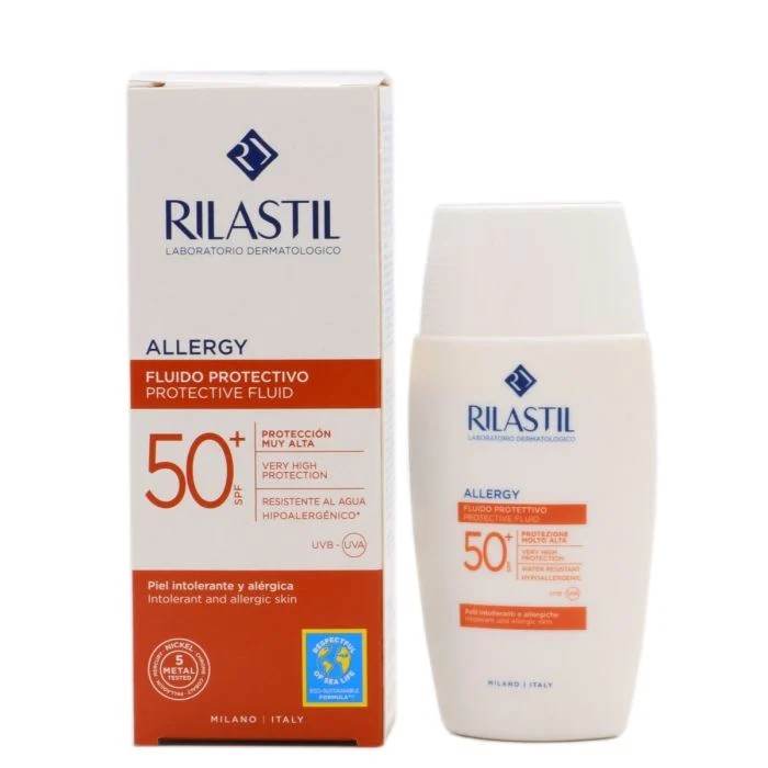 RILASTIL ALLERGY SPF50+ FLUIDO PROTECTIVO 50ML. Emulsión específica ultraligera y sin rastro blanco formulada para proteger y calmar las pieles alérgicas e intolerantes a cosméticos comunes, perfumes y conservantes.