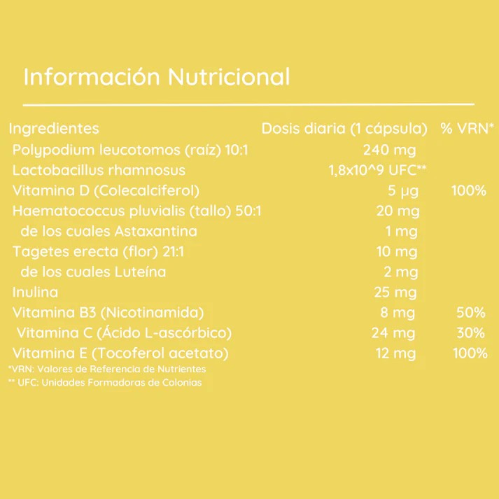 Ingredientes activos: Extracto de Polypodium leucotomos: helecho con propiedades antiinflamatorias y antioxidantes a nivel cutáneo. Lactobacillus rhamnosus, inulina, vitamina C, E, B3, D.