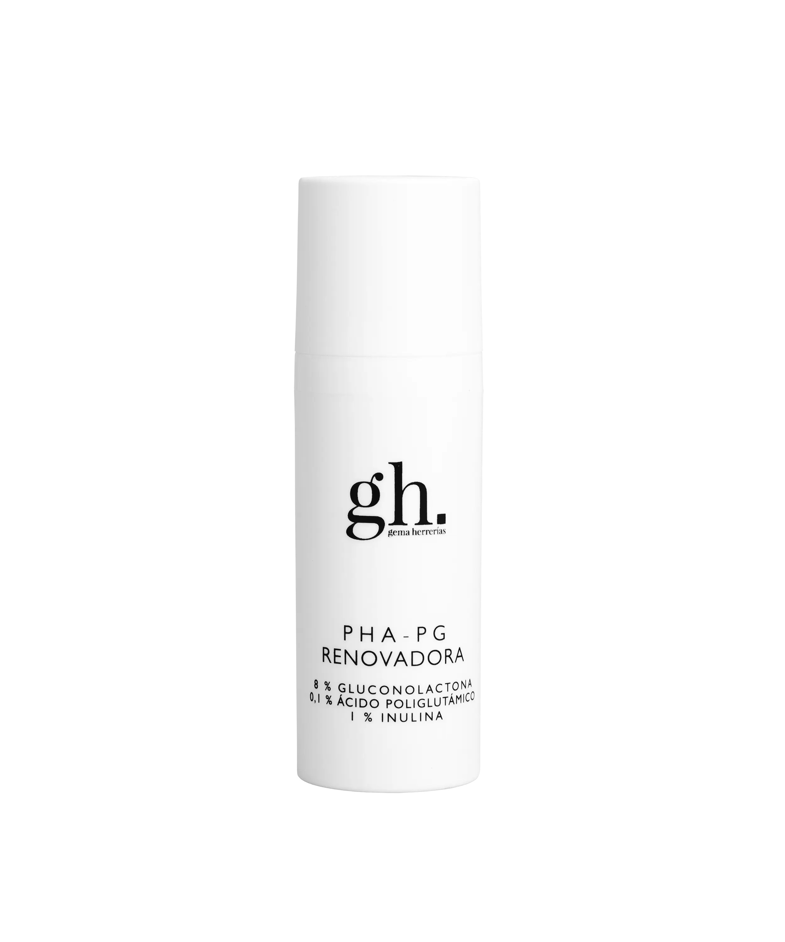 PHA-PG crema renovadora. Formulada con gluconolactona, ácido poliglutámico e inulina, es un eficaz cremagel fluida con función renovadora antiedad de alta tolerancia, que aumenta la producción del factor natural de hidratación, preserva la función barrera y evita la pérdida de agua transepidérmica. Mejora los signos de envejecimiento, unifica la textura y el tono de la piel. Tiene propiedades antioxidantes gracias a su contenido en extractos de manzana. Está indicada para todas las tipologías cutáneas, incluidas las pieles sensibles, con rosácea o dermatitis atópica. Formulada a pH ~ 4.