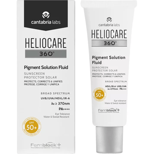 HELIOCARE 360º Pigment Solution Fluid SPF 50+. Fluido fotoprotector ultraligero para prevenir y corregir las hiperpigmentaciones solares y unificar el tono de la piel.
