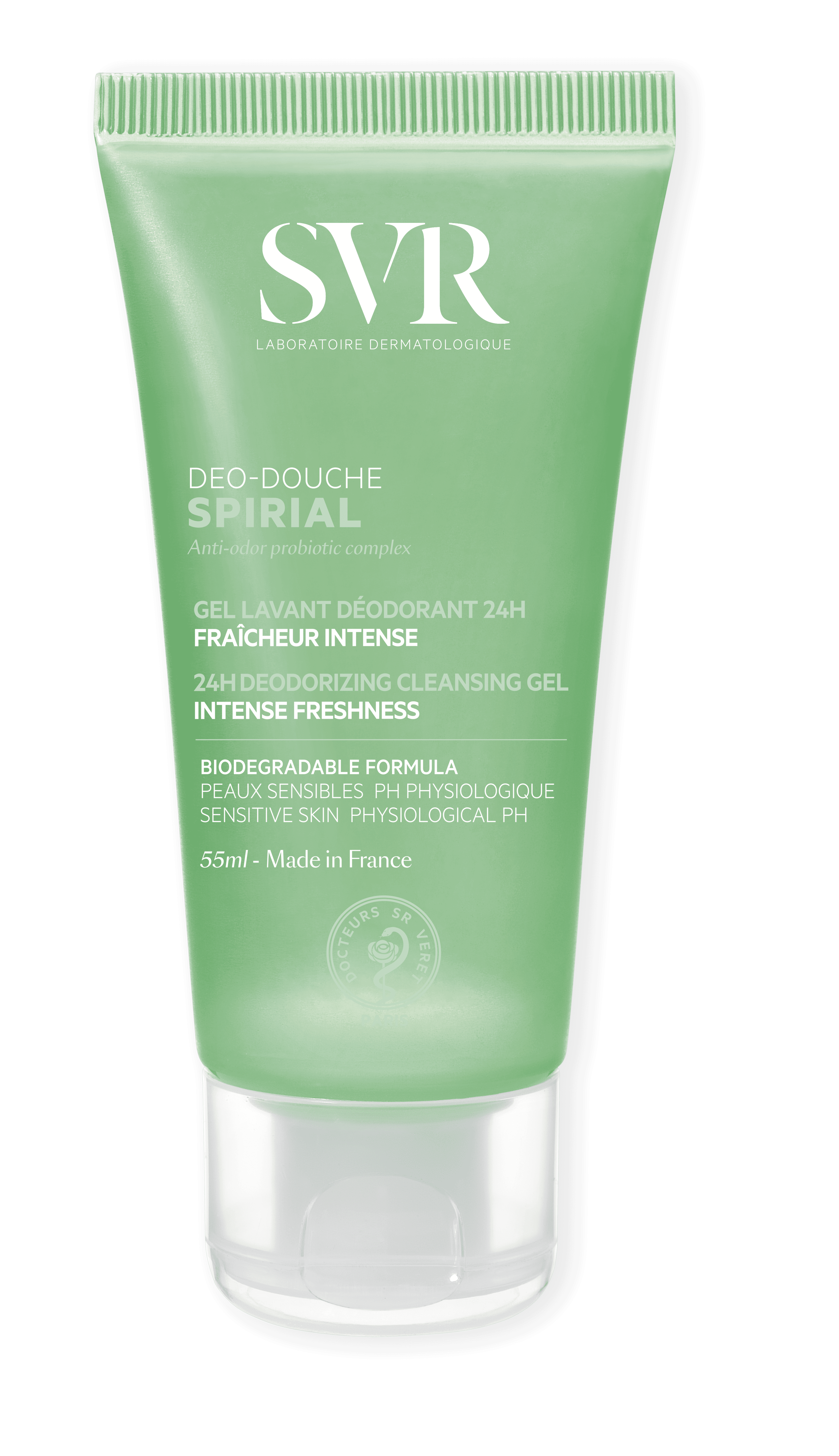 Deo-douche SPIRIAL gel de ducha desodorante de SVR. Gel de ducha 2 en 1, limpieza corporal y desodorante 24h. Previene el olor corporal manteniendo la microbiota de la piel, incluso de las pieles más sensible. La piel se siente fresca y suave y el olor corporal se controla durante 24h.